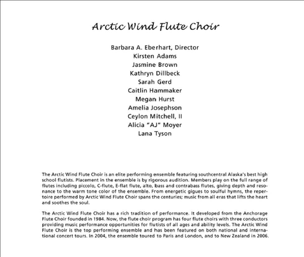 The Arctic Wind Flute Choir has a rich tradition of performance. It developed from the Anchorage Flute Choir founded in 1984. Now, the flute choir program has four flute choirs with three conductors providing music performance opportunities for flutists of all ages and ability levels. The Arctic Wind Flute Choir is the top performing ensemble and has been featured on both national and international concert tours. In 2004, the ensemble toured to Paris and London, in 2006, to New Zealand.
