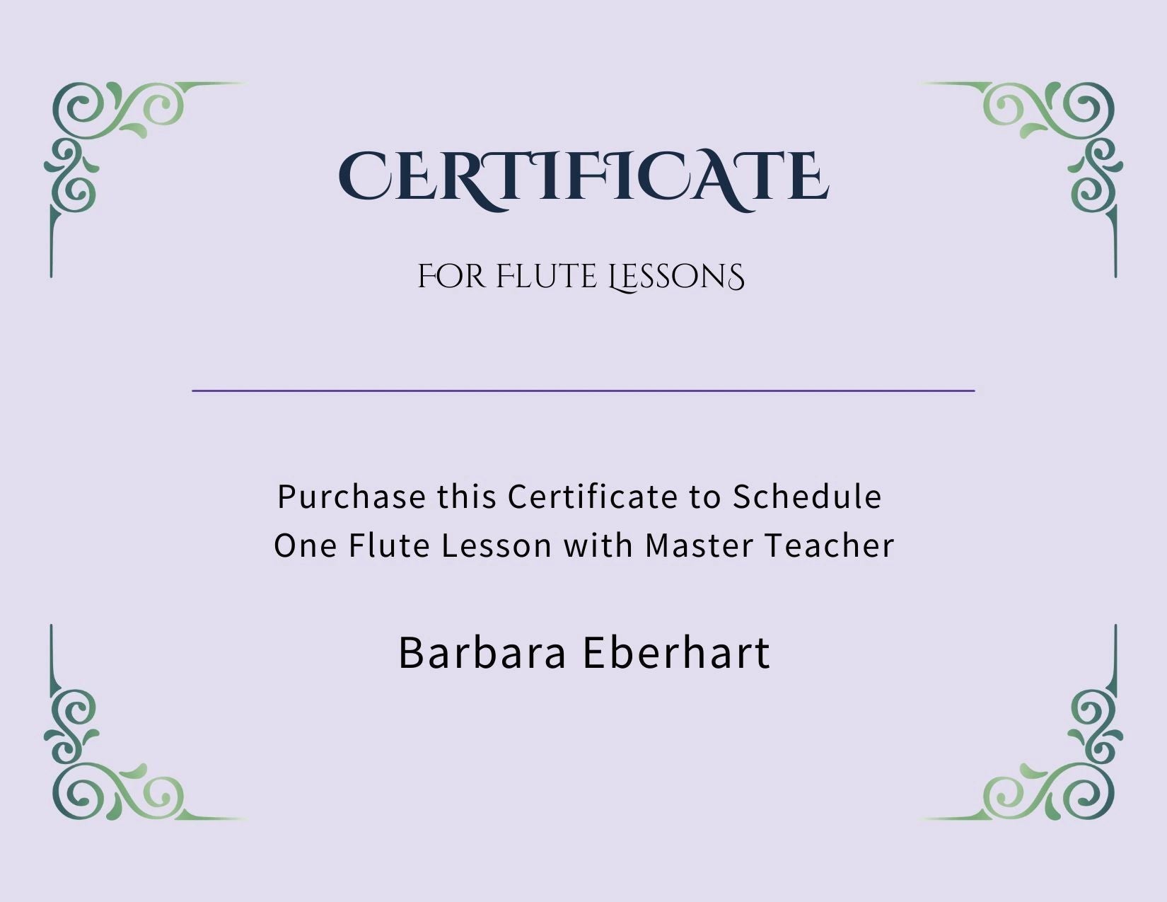 The purchase of a certificate is for one 60 minute, online lesson with flutist Barbara Eberhart. Email Glass Path Arts for more information and scheduling.