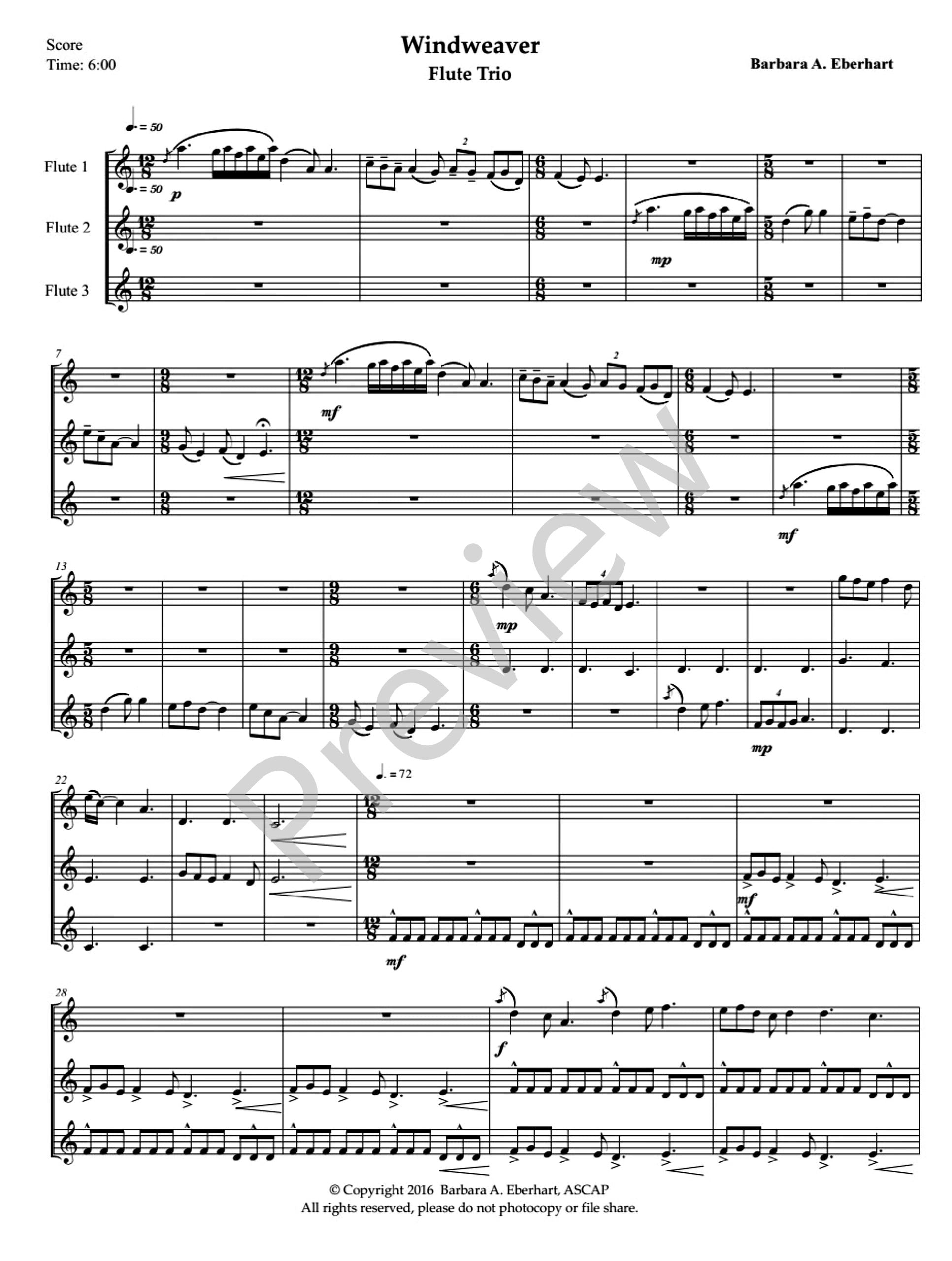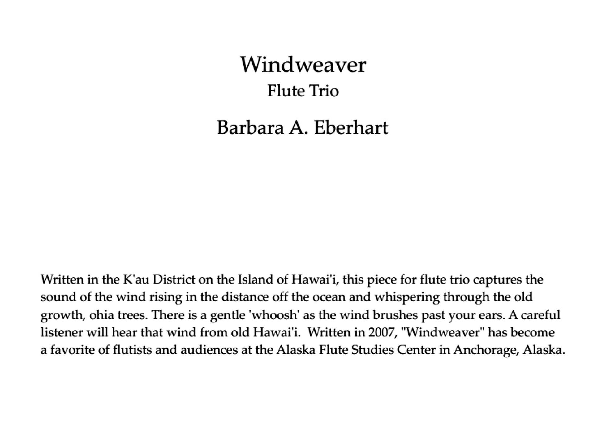 Written in the K'au District on the Island of Hawai'i, this piece for flute trio captures the sound of the wind rising in the distance off the ocean and whispering through the old growth, ohia trees. There is a gentle 'whoosh' as the wind brushes past your ears. A careful listener will hear that wind from old Hawai'i. Written in 2007, "Windweaver" has become a favorite of flutists and audiences at the Alaska Flute Studies Center in Anchorage, Alaska. Windweaver Flute Trio 6:00