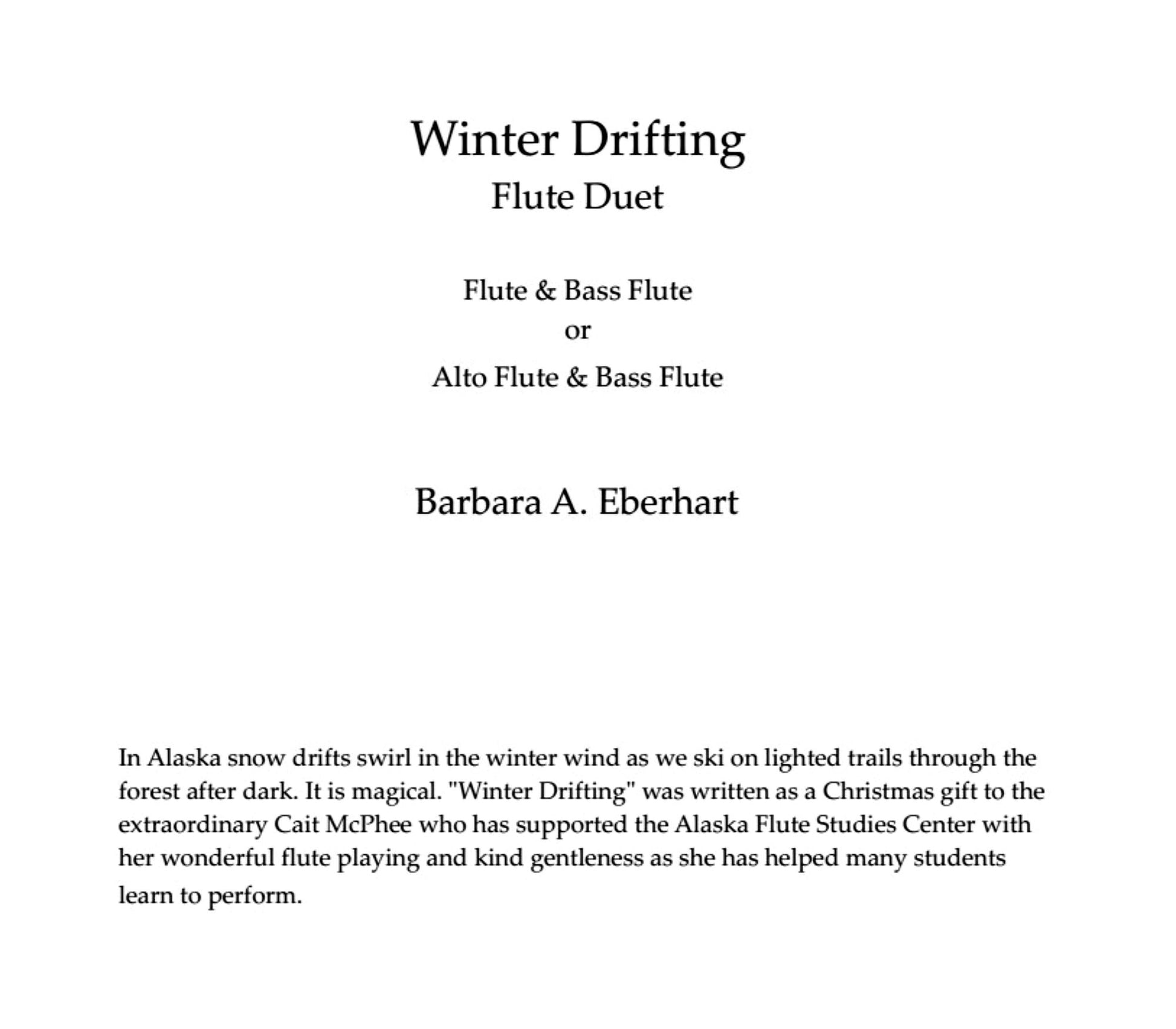 In Alaska snow drifts swirl in the winter wind as we ski on lighted trails through the forest after dark. It is magical. "Winter Drifting" was written as a Christmas gift to the extraordinary Cait McPhee who has supported the Alaska Flute Studies Center with her wonderful flute playing and kind gentleness as she has helped many students learn to perform.